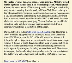 مقالي @semafor عن إطلاق MS Now. الاستراتيجية حتى الآن: - كبسولات جديدة - شرح يوتيوب، "البث المتزامن" على يوتيوب - فعاليات MS Now الحية في جميع أنحاء البلاد - منتجات الاشتراك المدفوع - دور موسع لبابلو توري - تعاون، صفقة محتملة مع كروكد ميديا