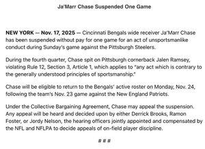 NFL suspendovala wide receivera Bengals Ja'Marra Chase za to, že plivl na DB Steelers Jalena Ramseyho. Chase popřel, že by na Ramseyho plival, ale liga rozhodla, že videozáznam je dostatečný k trestu.