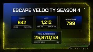 Čtvrtá sezóna Escape Velocity zaznamenala během pouhých 3 týdnů spálení přes 25 milionů $BLACK mezi 842 způsobilými peněženkami Všechny veNFT byly distribuovány 🪂 Užijte si vyšší volební sílu 🔒