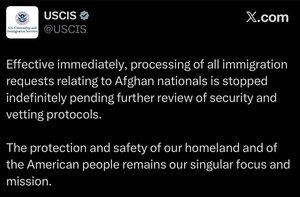 Les Services de citoyenneté et d'immigration des États-Unis (USCIS) ont annoncé qu'ils suspendent immédiatement toutes les demandes d'immigration liées aux ressortissants afghans, suite à l'attaque ciblée d'aujourd'hui par un Afghan contre des membres de la Garde nationale à Washington, D.C.
