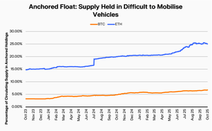Float produktif BTC telah didukung oleh sekuritisasi aset Strategy. ETH berada di 4x lipat dari BTC mengingat saldo LST dan penggunaan dalam DeFi. Ini mencairkan SoV-ness ETH, dengan BTC meninggalkan lebih banyak koin tanpa beban.