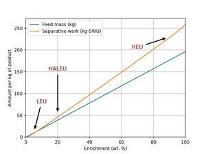 Ecco quanto lavoro separativo e materiale di partenza ti serve per un kg di uranio arricchito a vari livelli di arricchimento. Entrambe le relazioni sono quasi lineari, quindi un kg di HALEU al 20% richiede circa 4 volte più uranio di partenza e 4 volte più SWU rispetto a un kg di LEU. Anche senza un premio HALEU, avresti bisogno di un burnup 4 volte più alto nel tuo reattore alimentato a HALEU per pareggiare i costi del combustibile con un reattore LEU più neutronicamente efficiente (supponendo una massa del nucleo costante).