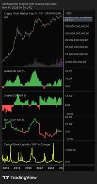 これが、ジャンクが一線を画すのを見たい理由です 2024年1月にETFが発売されて以来、HYGがTLTを上回るパフォーマンスを発揮するのと、基本的にほぼ歩調を合わせて動きました これはまだ上昇トレンドにありますが、途中でこれらのシェイクアウトと保ち合いを伴い、「より長く上昇」し続けるつもりだと思います また、1年以上前に書いた「金融の深化」に関する記事から、2020年第3四半期は、世界のM2/世界のGDPの絶対的な水準に関連しているため、2020年第3四半期で立ち往生しています。 以前のサイクルを見て、これら 2 つの間の前年比デルタが 2019 年に似ており、長い間続いていることがわかりますが、これは今回のサイクルの仮想通貨の幅の欠如を少なくとも部分的に説明していると私は今でも信じています (Obvsこれは、1.データのリリース方法による遅れ、2.主にドルの日々の変化に変化するため、非常に大雑把な尺度です。 ETFの発売以来一貫していたステーブルコインの優位性と実質金利の関係は、おそらく政府の閉鎖+10/10後のダイナミクスの組み合わせで、10月以降分岐している