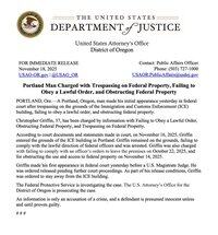 ポートランドの左翼暴動容疑者が、少なくとも8回不法にICEの建物に戻り、秩序を乱した行為により連邦起訴されました。 クリストファー・グリフィンは、合法的な命令に従わなかったこと、連邦財産の妨害、不法侵入の罪で起訴されました。
