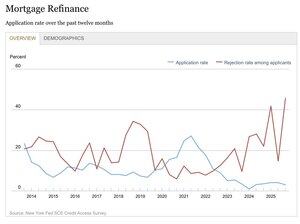 SCEプレス@NYFedResearch熱々: 「過去12か月間のあらゆる種類のクレジットの拒否率は、6月の23.1%から24.8%に上昇し、これは新たなシリーズ最高です。住宅ローン、自動車ローン、住宅ローン借り換えの拒否率が上昇しました。 借り換えでは、拒否率が過去最高の45.7%に達しました