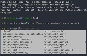 OAuthをサポートするmcp2pyの最初の完全版をリリースできることを非常に楽しみにしています! MCP には、以前のモバイル アプリや Web サイトがそうであったように、次の配信標準になる真のチャンスがあります。モバイルアプリを持つすべての企業もMCPを持つ標準になるとしたら、mcp2pyのようなツール、より一般的にはmcp2から任意のプログラミング言語へのツールは、基本的に、どの/すべての企業がどの言語でも「ライブラリ」に似たものを持つことを意味します。 以下の例では、わずか 2 行のコードでプログラムで Notion を操作できる部分を垣間見ることができます。これにより、ログインできるポップアップウィンドウがトリガーされ、その後、NotionがLLM(またはあなたのコード)用に設定したプログラムによるアクセスのリストと、LLM(またはあなた)がその使い方を知るために各関数に必要不可欠なすべての優れたドキュメントが表示されます。 mcp2pyライブラリのMITライセンスGitHubリポジトリについては、以下のリンクを参照してください。 追伸:これは、MCPについて少し学び始めるのにも非常に良い方法です。GitHubのMCPレジストリのようなものにアクセスして、mcp2pyでそれらのいくつかを試して、それらのAPIがLLMに提供するツールと命令の種類を調べることができます。