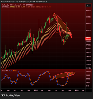 #BTC Dominance Weekly er veldig bearish ✅Bearish nedadgående trend ✅Bearish struktur ✅Bearish flagg/stigende kile ✅Bearish RSI-oppsett ✅Bearish stokastisk RSI-oppsett ✅Bearish EMA Ribbons avslår