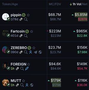 Topp Pumpfun-mynter for den siste 1 timen basert på volum: $Pippin $Fartcoin $Zerebro $Foreign $Mutt