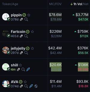 Topp Pumpfun-mynter for den siste 1 timen basert på volum: $Pippin $fartcoin $Jellyjelly $Verse $Swarms