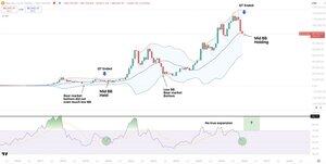 For det tredje kan vi se at i 2019, omtrent da QT tok slutt, trakk Bitcoin seg tilbake til mellomnivå Bollinger-båndet og fant støtte.