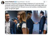 James "fake it till you make it" Fishback zegt dat hij zich kandidaat stelt voor gouverneur van Florida met een felle anti-H1B-standpunt. "Als gouverneur zou ik de H-1B-oplichting beëindigen," verklaart Fishback vaak in zijn onophoudelijke berichten op X.