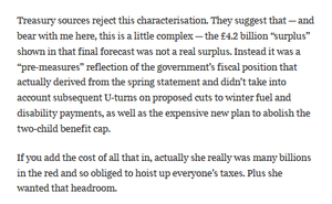 Bronnen van het ministerie van Financiën beweren dat het overschot waarmee ze te maken hadden niet telde omdat ze van plan waren veel meer uit te geven.