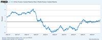 De eerste grafiek toont de 3-Maands Treasury (blauw) versus de 10-Jarige Treasury (rood)
