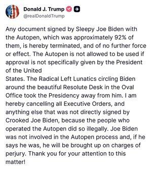 Prezydent USA Donald J. Trump stwierdził w poście wcześniej na Truth Social, że „zakończy” wszelkie dokumenty podpisane przez prezydenta Joe Bidena przy użyciu autopen, co, jak twierdzi, stanowiło około 92% wszystkich jego rozporządzeń wykonawczych. Chociaż nie wydaje się, aby istniała jakakolwiek podstawa prawna dla tego stwierdzenia lub działania prezydenta Trumpa, nic nie stoi na przeszkodzie, aby mógł on nadpisać rozporządzenia wykonawcze Bidena za pomocą własnych rozporządzeń wykonawczych, tak jak miało to miejsce w przypadku wszystkich poprzednich prezydentów.