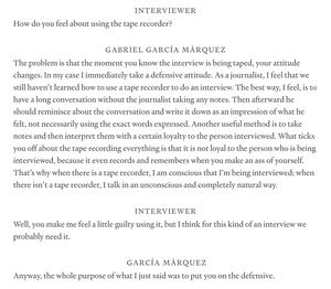 Uwielbiam Gabriela Garcíę Márqueza. Wyobraź sobie, że przeprowadzasz wywiad z kimś wielkim i to jest pierwsza rzecz, którą ci mówi, trząsłbym się.