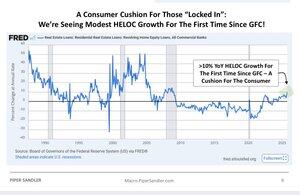 Co więcej, pogląd, że „wszyscy są zamknięci”, traci na znaczeniu z każdym dniem. Choć jest to problem długoterminowy, rozważ to: Obecnie 30% aktywnych kredytów hipotecznych ma oprocentowanie 5% lub wyższe - ci ludzie nie są zamknięci. Dla tych z niższymi stopami procentowymi mają dużo kapitału własnego, a gdy Fed obniża stopy, oprocentowanie HELOC spada, co tworzy większą potencjalną poduszkę wydatków konsumpcyjnych. Obecnie wzrost kredytów HELOC przekracza 10% po raz pierwszy od kryzysu finansowego. Obecnie istnieje rekordowe 35 bilionów dolarów kapitału własnego w domach, które mogą być wykorzystane do wspierania wydatków lub być źródłem pożyczek, które są znacznie lepsze niż karty kredytowe (20%).