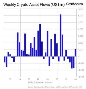 Os ETPs de ativos digitais registaram $1.07 mil milhões em entradas após quatro semanas de fortes saídas, ajudados pela esperança de um corte nas taxas nos EUA após comentários do membro do FOMC John Williams
