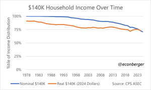 În ultima jumătate de secol, un venit nominal de 140.000 de dolari a trecut de la "persoană bogată caricatural" la "capătul inferior al clasei mijlocii superioare". Mă întreb cât de mult influențează această iluzie a banilor discursul non-tehnic