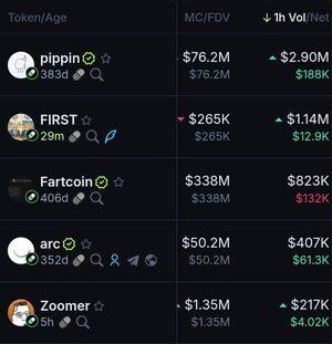 Топ монет Pumpfun за последние 1 час по объему: $Pippin $First $Fartcoin $Arc $Zoomer