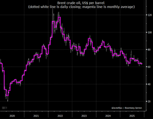 DAGENS DIAGRAM: På månadsgenomsnitt nådde Brent-råolja en 41/2-årslägsta i november (den bytte ägare med ett genomsnitt på 63,66 dollar per fat under månaden, det lägsta månadsgenomsnittet sedan februari 2021)