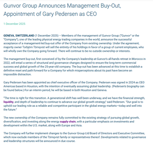 NYTT NYTT: Oljehandelsjätten Gunvor tillkännager ett ledningsuppköp, där medgrundaren Torbjörn Törnqvist säljer sin andel till en grupp anställda. Företaget har inte meddelat några ekonomiska detaljer.
