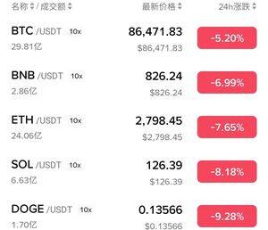 Bitcoin (BTC) föll till 86 000 dollar (ner 5–6 %), och Ethereum (ETH) sjönk till 2 823 dollar (ned 6–10 %).