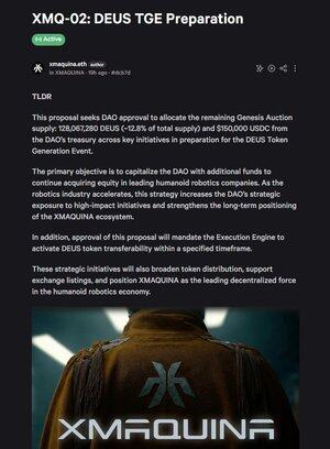 Teklifte, satışın ana amacının, insansı robot şirketinde hisse edinmeye devam etmek için DAO'ya daha fazla para yatırmak olduğu belirtildi. Ayrıca, teklifin onayı, motorun DEUS tokenlarının transfer edilebilirliğini belirli bir zaman diliminde etkinleştirmesini zorunlu kılacaktır. Öneri oylaması 6 Aralık'ta sona erecek ve mevcut onay oranı %95,39'dur.