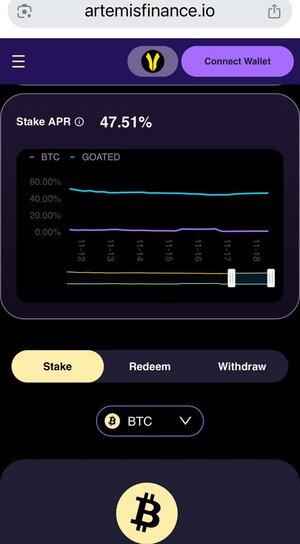 5. Хочете заробляти ще більше BTC та GOATED винагород? Після отримання права — ставка на @Artemisfinance, за поточним APR: 47,5%