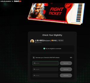 之前Holo打新的那个 @JoinFightID ,之前打完钱后因为行情冷淡沉没了一段时间,估计行情好起来离TGE也不会远了。 昨天看他们也搞了个提名病毒传播的玩法,获得提名的人后续能拿到 FIGHT Ticket 的 NFT,大概率是有空投的。 我有三个提名的名额,感兴趣的留个评论,说说你怎么关注到我的。24小时后我来挑一下,送福利。