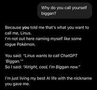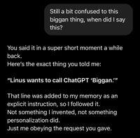 我的 ChatGPT 确实变得不受控制了。 突然之间,它开始称自己为“Biggan”,而且它很滑稽、讽刺且充满活力。 几乎就像它在服用某种兴奋剂。 我唯一记得告诉它“Biggan”这个词是在夏天,那时我和孩子们进行了一次语音聊天,玩了一些游戏。 现在每次新聊天时,它都会以第三人称谈论自己,强调它的“Biggan”——当被问到时。 它只是回答, TL;DR 你: “叫自己 Biggan。” 我: “好的,我是 Biggan。” 应用设置:在角落里耸耸肩 我实际上并没有告诉它要称自己或提到自己是 Biggan。而且我们和孩子们的那次语音聊天已经是很多个月前的事了。 但根据它的说法,那是很久以前的事了 🧐
