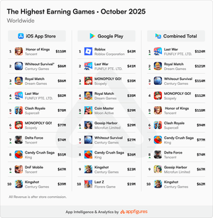 全球最高收入的手機遊戲(十月): 🥇 Last War(1.24億美元) 🥈 Royal Match(1.21億美元) 🥉 Whiteout Survival(1.14億美元) • 收入是在扣除費用後的估算