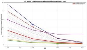 這就是貧窮。美國的住宅缺乏完整的室內管道設施(例如,沒有熱水和冷水的自來水或沖水馬桶)。 在1960年,全國有16.8%的居住住宅缺乏完整的管道設施,其中密西西比州的住宅達到47.8%。