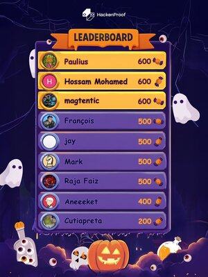 最終任務答案: 🎃 來自HackenProof的問候!萬聖節快樂,漏洞獵人!👻 獲獎者: @SolidityDev @HOSAM_24180 @magtentic